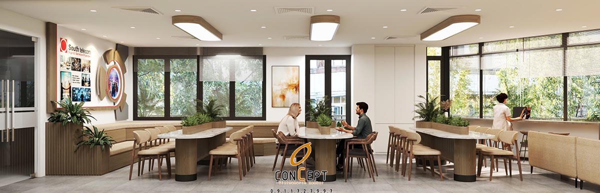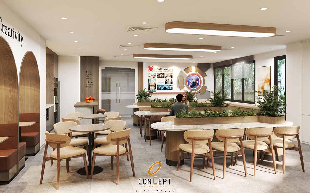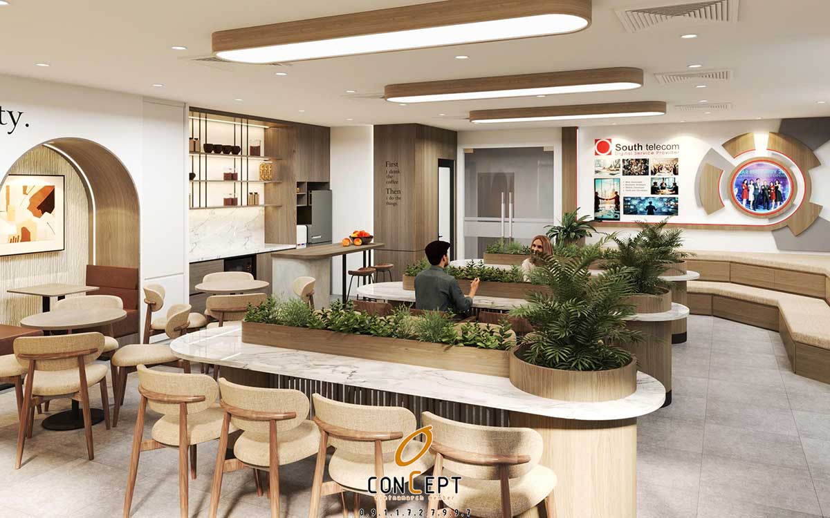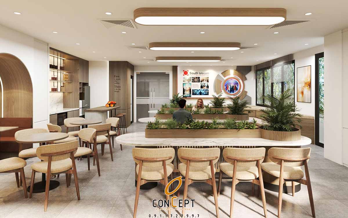 Với quy mô 90m2, mục tiêu thiết kế là xây dựng một văn phòng đa chức năng bao gồm khu làm việc chung, khu trao đổi – sáng tạo, không gian pantry thư giãn và các khu vực hỗ trợ khác. Định hướng thiết kế nội thất văn phòng 90m2 tại Hà Nội cho South Telecom tập trung vào phong cách hiện đại, sử dụng vật liệu gỗ sáng, đường nét bo tròn mềm mại và kết hợp cây xanh nhằm tạo cảm giác thân thiện, gần gũi nhưng vẫn đảm bảo tính chuyên nghiệp.