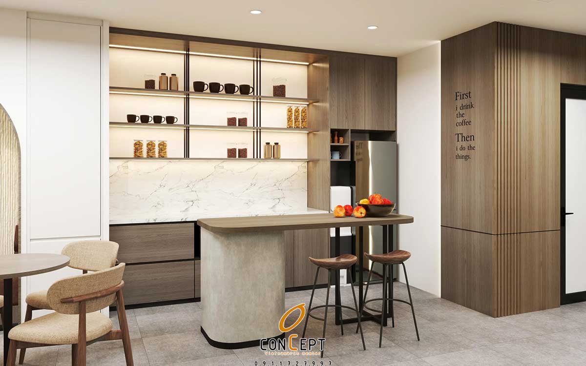 Khu pantry được thiết kế như một quầy bar nhỏ, kết hợp kệ lưu trữ, tủ lạnh và bàn cao với ghế bar. Đây không chỉ là nơi nghỉ ngơi, ăn nhẹ mà còn là không gian giao lưu nội bộ, giúp cân bằng giữa làm việc và thư giãn. Việc sử dụng vật liệu gỗ, đá sáng màu và ánh sáng ấm mang lại cảm giác ấm cúng, thân thiện cho toàn bộ khu vực.