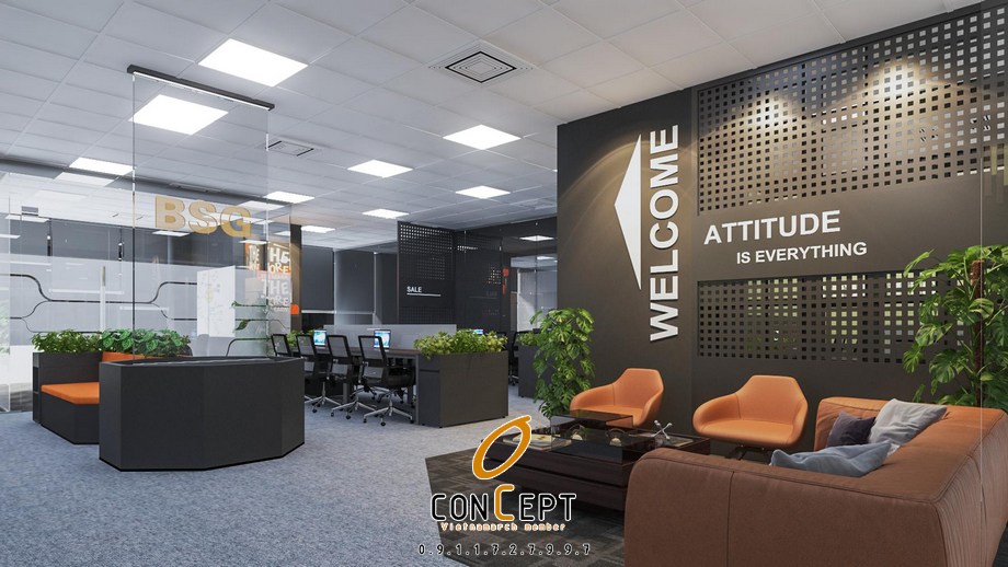 Diện tích văn phòng bất động sản BSG 190m2 được phân chia và bố trí một cách khoa học, tạo nên không gian làm việc hiệu quả. Nội thất văn phòng được trang bị đầy đủ tiện nghi, từ việc sắp xếp không gian mở, cây xanh nội thất, đến bàn ghế văn phòng, đều tạo nên sự hài hòa toàn diện. Với tông màu trầm sang trọng, văn phòng BSG thu hút ánh nhìn. Phong cách thiết kế văn phòng mở, linh hoạt và năng động mang lại không khí mới mẻ cho không gian làm việc hiện đại.