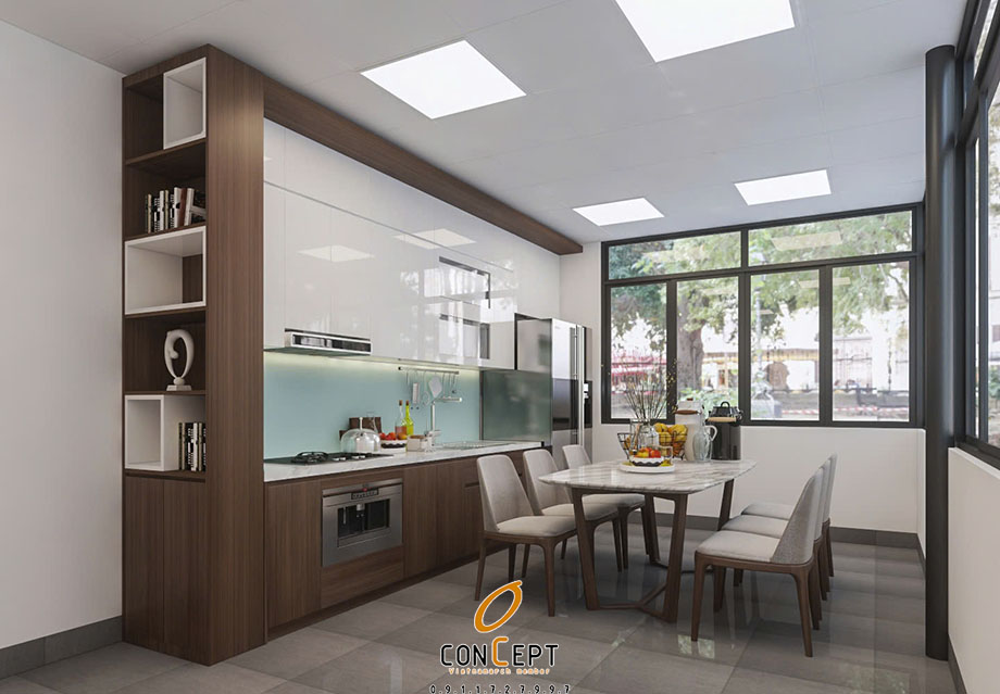 - Khu vực bếp – ăn được bố trí liên thông, phù hợp với đặc trưng nhà lô phố.