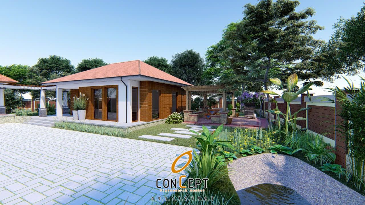 Mẫu thiết kế nhà vườn cấp 4 nghỉ dưỡng được chia thành 3 khu vực chính: nhà chính – khu nghỉ – không gian thư giãn ngoài trời. Ngôi nhà chính được thiết kế mái ngói đỏ cam đặc trưng, hệ cột vuông ốp đá vững chãi, kết hợp cùng cửa gỗ nâu trầm tạo cảm giác sang trọng và gần gũi. Toàn bộ không gian hướng ra khu vườn xanh mát, nơi có hồ nước nhỏ, thảm cỏ, giàn pergola gỗ và khu bàn trà thư giãn.