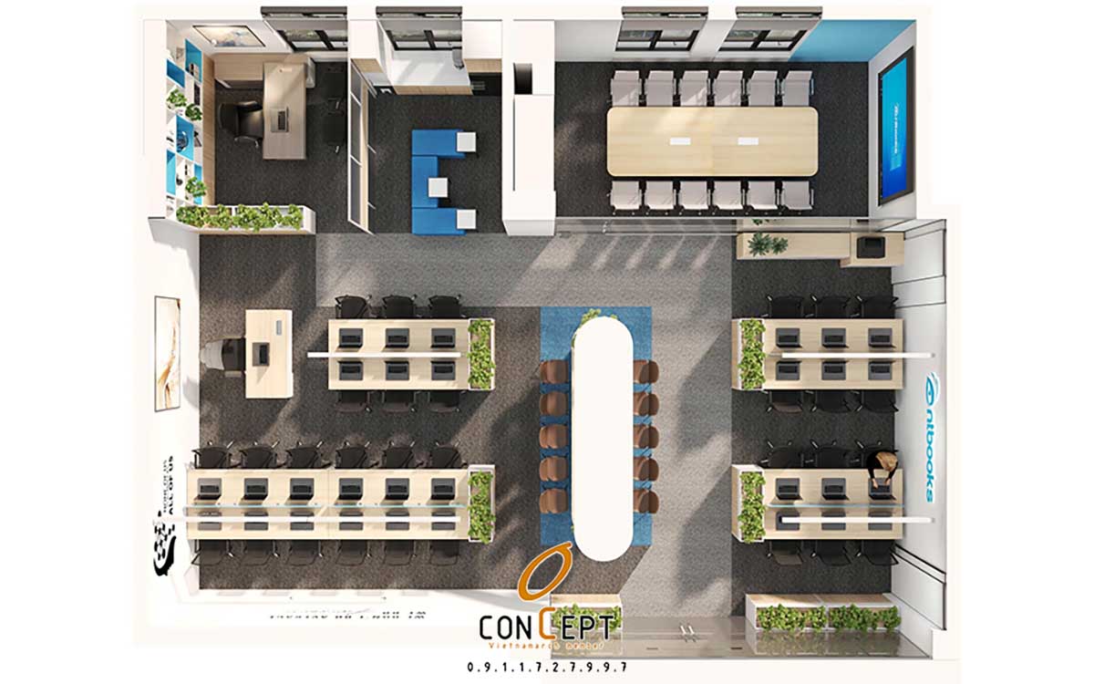 Với lợi thế thiết kế và thi công nội thất văn phòng trọn gói, Oconcept kiểm soát tốt chất lượng, tiến độ và chi phí, đảm bảo công trình hoàn thiện đúng thiết kế và đạt hiệu quả sử dụng lâu dài. Dự án văn phòng NTBOOKS tại Hà Nội là minh chứng cho uy tín và năng lực của Oconcept trong lĩnh vực nội thất văn phòng.