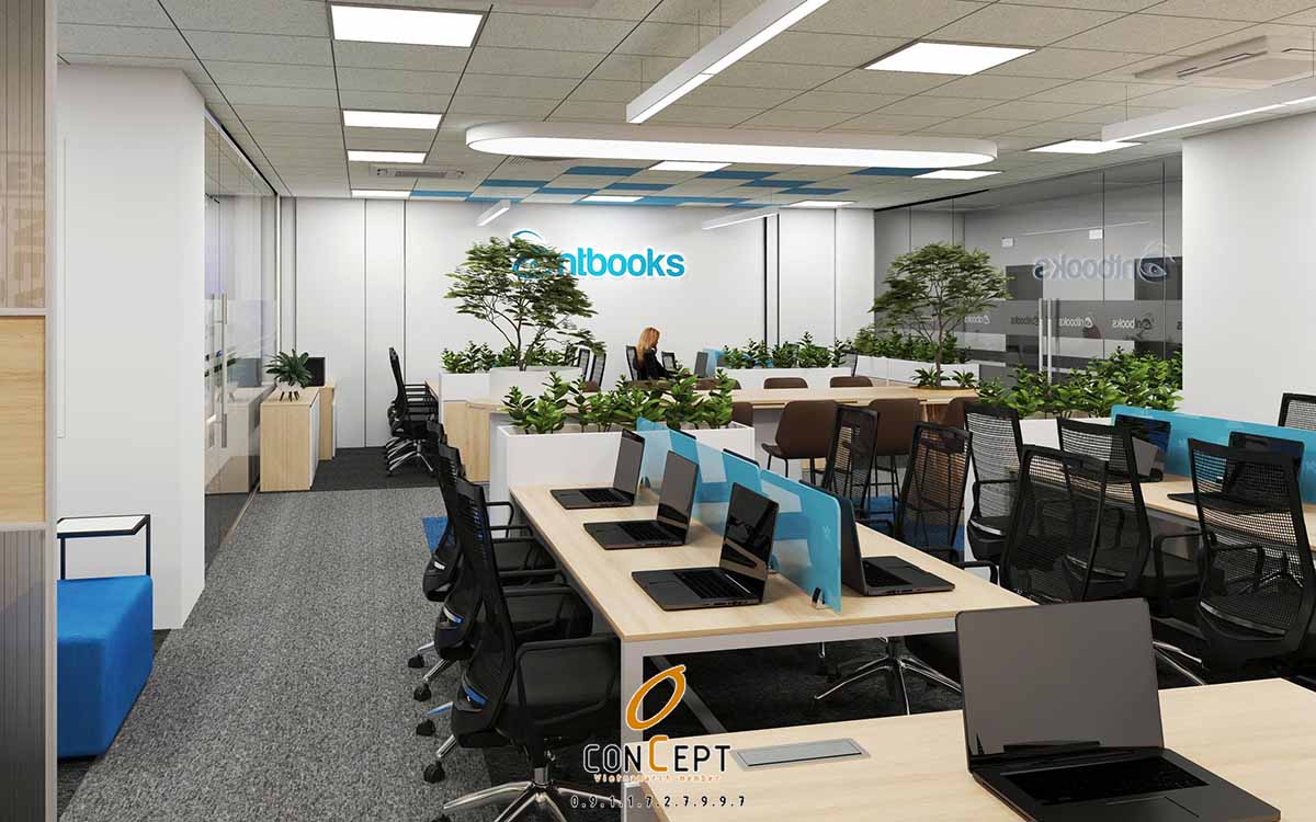 Khu vực làm việc chung được bố trí theo mô hình open office, sử dụng hệ bàn dài kết hợp vách ngăn thấp màu xanh. Cách bố trí này giúp tối ưu diện tích, tăng số lượng chỗ ngồi nhưng vẫn đảm bảo sự tập trung cần thiết cho từng cá nhân. Các bồn cây xanh được bố trí xen kẽ giữa các cụm bàn, vừa đóng vai trò phân chia không gian mềm, vừa tạo cảm giác dễ chịu khi làm việc trong thời gian dài.