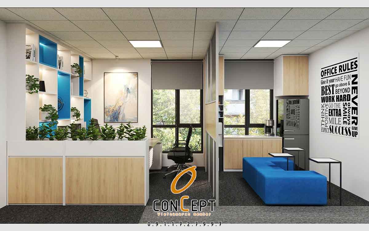 Hệ tủ lưu trữ, kệ trang trí được thiết kế áp tường, kết hợp giữa vật liệu gỗ sáng và các mảng màu xanh, vừa đảm bảo công năng lưu trữ hồ sơ, vừa tăng tính thẩm mỹ cho không gian. Khu vực pantry nhỏ, góc nghỉ nhanh được bố trí gọn gàng, đáp ứng nhu cầu sinh hoạt cơ bản và giúp nhân sự có không gian thư giãn ngắn trong giờ làm việc.