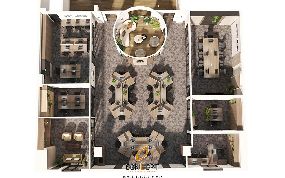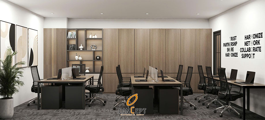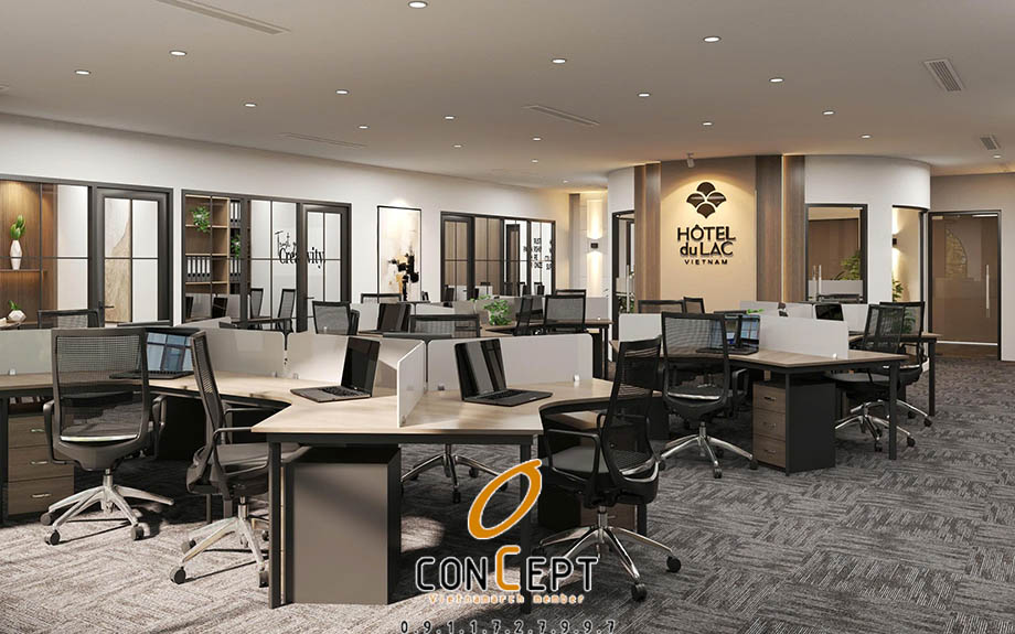 Khu vực làm việc open office chiếm phần lớn diện tích, sử dụng hệ bàn cụm hiện đại kết hợp ghế công thái học. Vách ngăn thấp giúp tạo sự riêng tư vừa đủ nhưng vẫn giữ được sự kết nối giữa các bộ phận. Tone màu trung tính như trắng, xám, gỗ tự nhiên mang lại cảm giác nhẹ nhàng, chuyên nghiệp và không gây mệt mỏi khi làm việc lâu dài.