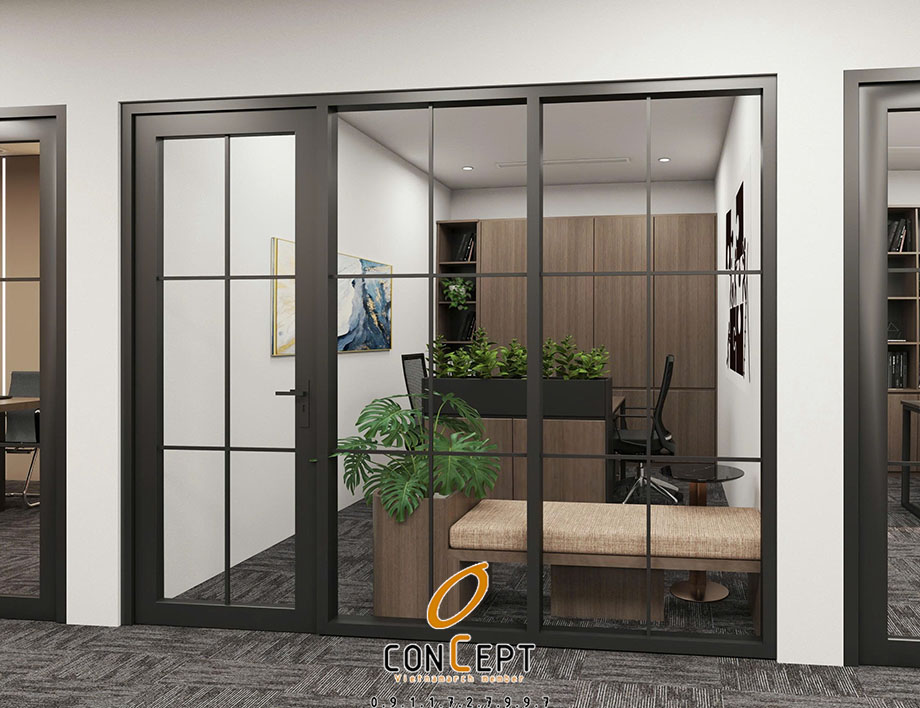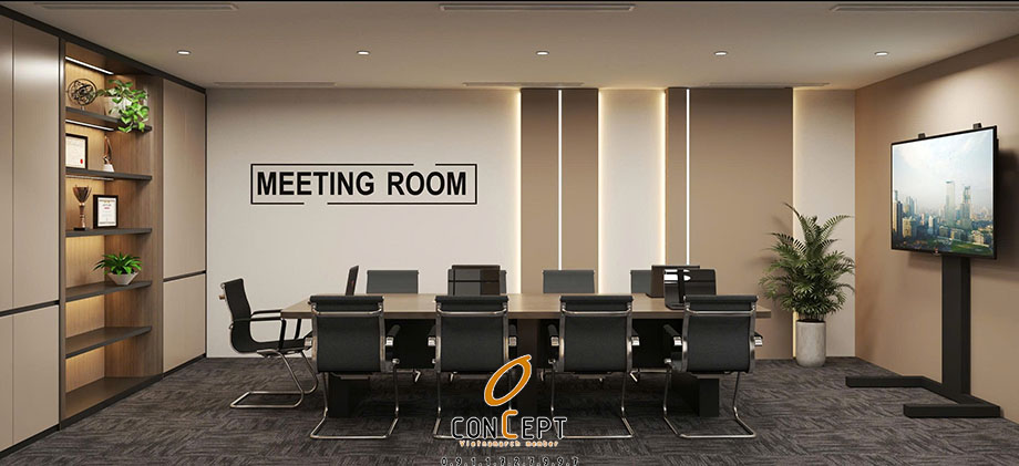 Các phòng họp trong thiết kế nội thất văn phòng 230m2 được bố trí bằng hệ vách kính khung kim loại, giúp không gian luôn thông thoáng và tận dụng ánh sáng. Nội thất bên trong được thiết kế tối giản, tập trung vào công năng, đảm bảo sự yên tĩnh và riêng tư cho các cuộc trao đổi quan trọng. Phòng làm việc riêng được sắp xếp hợp lý, thuận tiện cho lãnh đạo và các vị trí cần không gian tập trung cao.