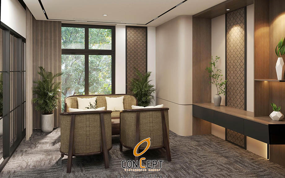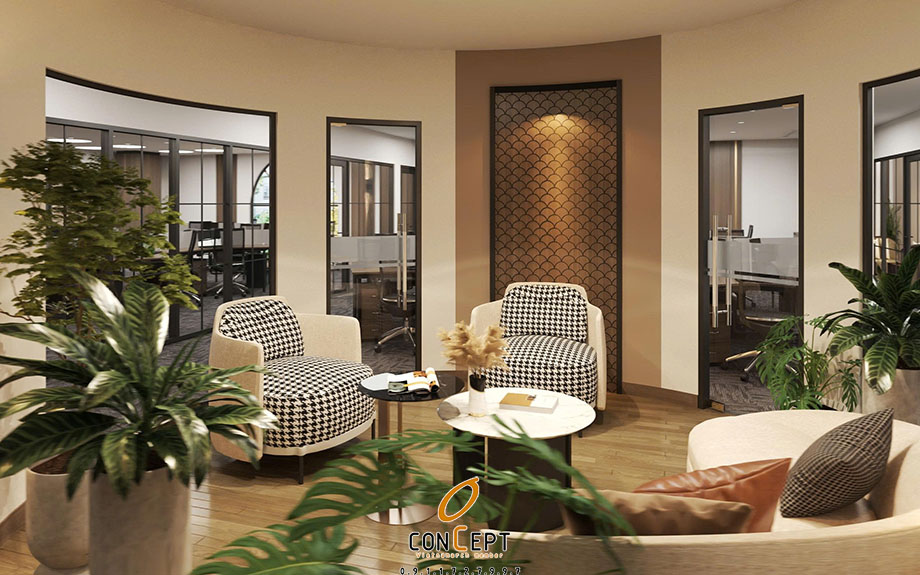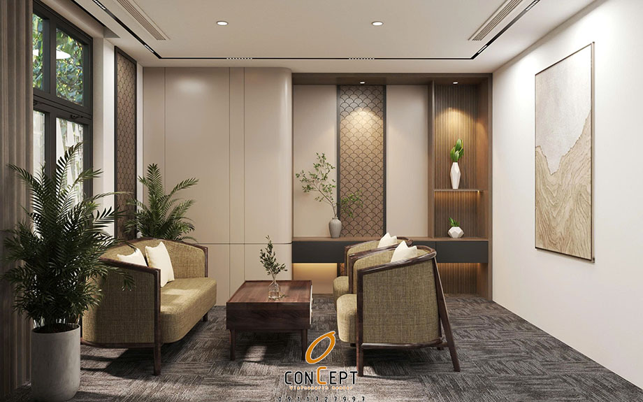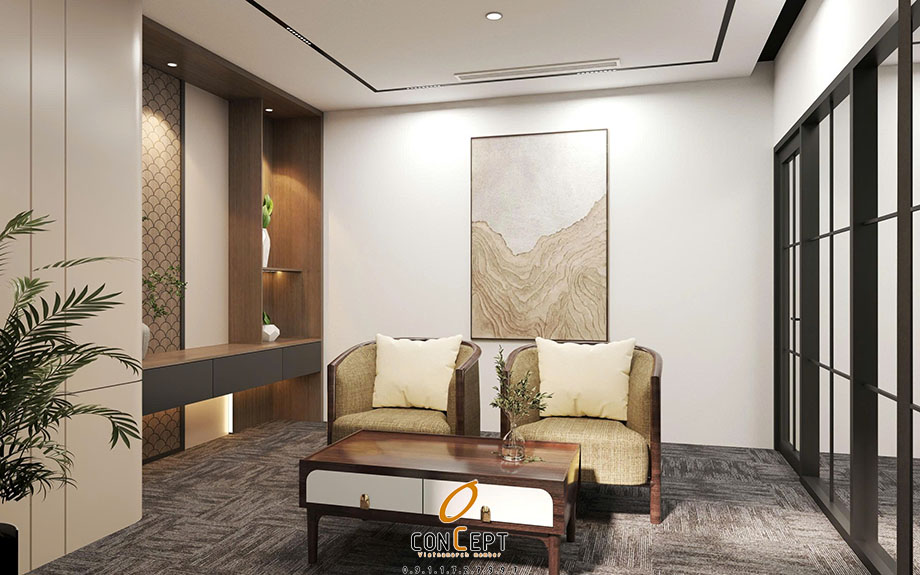 Khu lounge tiếp khách được thiết kế như một không gian thư giãn thu nhỏ với sofa bọc nỉ, bàn trà gỗ và hệ trang trí mềm mại. Việc đưa cây xanh và tranh nghệ thuật vào không gian giúp cân bằng cảm xúc, tạo ấn tượng thân thiện và chuyên nghiệp với đối tác ngay từ lần đầu ghé thăm.