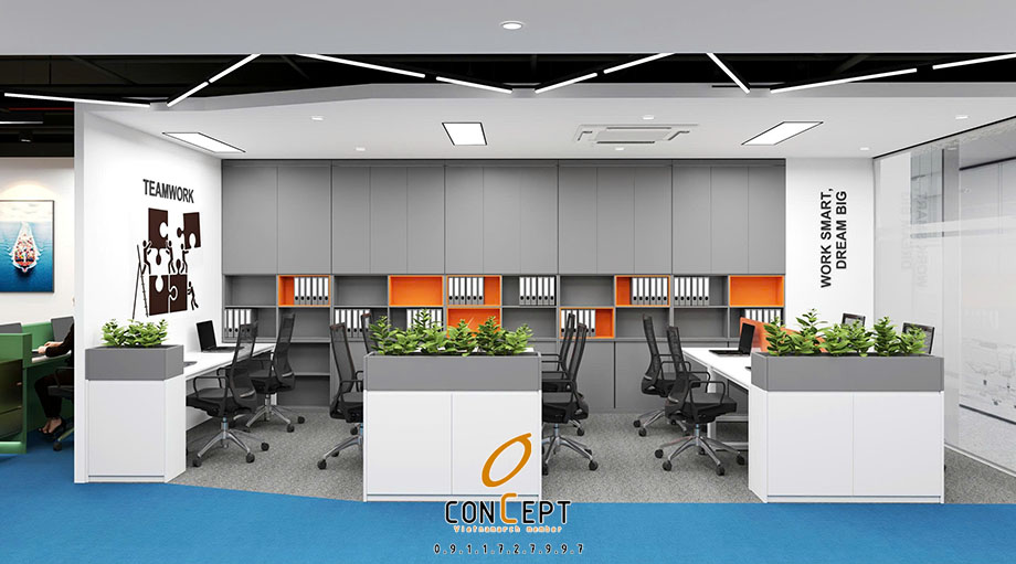 Không gian làm việc chung được bố trí theo mô hình open office với hệ bàn cụm, vách ngăn thấp kết hợp bồn cây xanh. Giải pháp này vừa đảm bảo sự tập trung cho nhân sự, vừa tạo cảm giác gần gũi, giảm sự khô cứng thường thấy trong các văn phòng diện tích nhỏ. Hệ tủ lưu trữ được thiết kế âm tường, tận dụng tối đa chiều cao không gian, giúp văn phòng luôn gọn gàng và ngăn nắp.