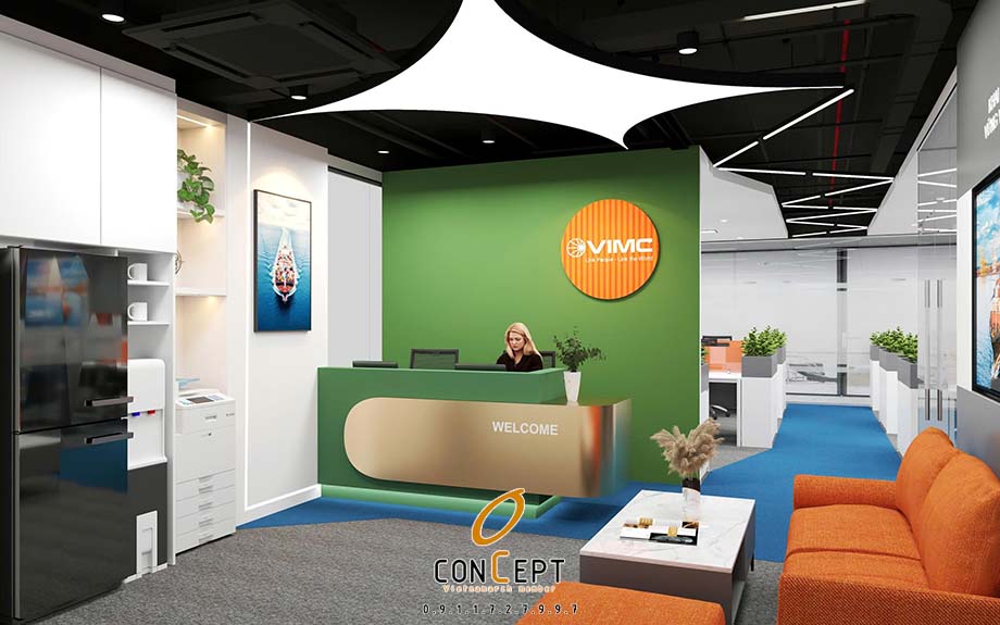 Khu vực lễ tân được đặt tại vị trí trung tâm, sử dụng gam màu xanh – cam đặc trưng của thương hiệu VIMC, tạo điểm nhấn mạnh mẽ về nhận diện ngay khi bước vào văn phòng. Quầy lễ tân thiết kế gọn gàng, hiện đại, kết hợp ánh sáng trang trí giúp tăng tính chuyên nghiệp và thân thiện.